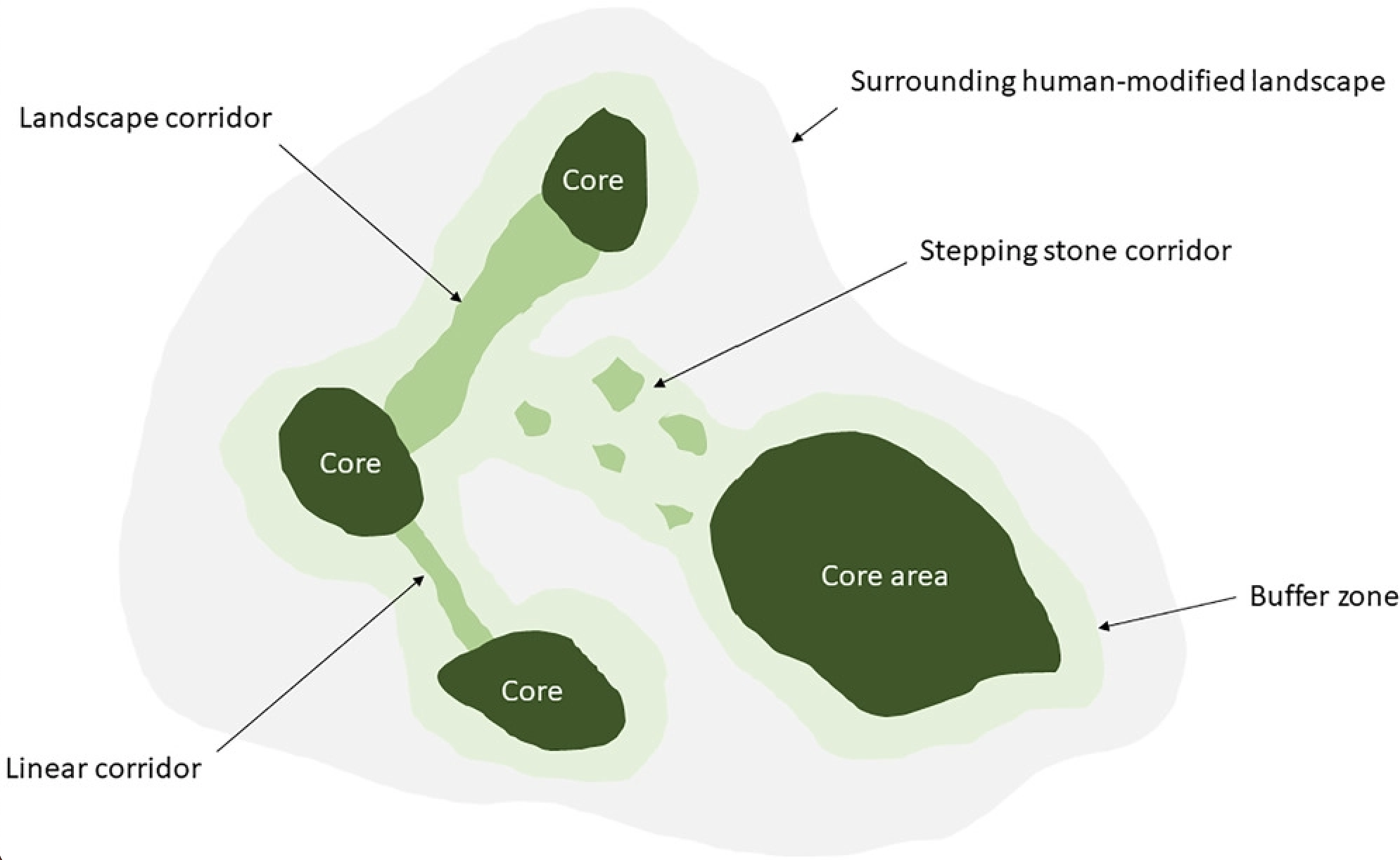 Corridors. Wildlife corridors are stretches with special restrictions and nature protection measures that connect the cores. Their main goal is to allow animals and plants to move between two or more core areas. These corridors create bridges through stretches of land where humans are more active or the vegetation is not native, both factors that can hinder animals from moving between habitats.